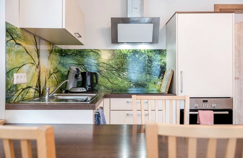 The holiday apartment Waldblick accommodates up to 5 people. You have one bedroom with a double bed and bunk bed, as well as another bedroom with a single bed. The fully equipped living kitchen offers a dining area, a Senseo coffee machine, a sofa, and a TV. The bathroom is fitted with a shower and a toilet. You also have access to a large terrace. A bread roll service and fresh eggs are available on request for an extra charge.