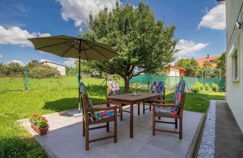 The holiday apartment built in 1990, was renovated in 2021 and is furnished in a modern style. The property is located in a holiday home area, on the outskirts. Also due to the view over the lake from the property and its quiet and sunny location the domicile is popular. Available for your exclusive use: sunbathing lawn, parasol, sun lounger, terrace and courtyard.LocationCserszegtomaj, 100 m above sea level. The holiday apartement is located on a 400 sqm enclosed garden plot with meadow, flowers, shrubs and trees, bordered by a fence. The landlord lives permanently in the house, but uses a seperate entrance. Access is via a side road (asphalted). Parking (for 2 cars) is available on the property. Specialair conditioning, central heating (gas), oven in every room (gas).Facilities: internet access (WLAN). TV reception takes place via electric wire, satellite.For your safety, the accommodation is equipped with smoke detector. Dogsnot allowed. DistancesShopping 800 m, restaurant 800 m, town center 800 m. railway station, thermal bath, indoor swimming pool, sauna, discotheque, cinema, doctor, pharmacy, bank each 5 km in Keszthely. airport in Sármellék 15 km. Railway line 5 km. Main road 450 m. Children's playground 800 m. In summer: Balaton 5 km in Keszthely (beach 5 km in Keszthely featuring meadow and sand). Keszthely: tennis, horse riding, fishing, water sports, boat launch each 5 km. dog beach 7 km. DivisionHoliday apartment, 1 floor, 2 rooms (including 2 bedrooms), 70 sqm, in total 4 beds. RoomThe entrance to your holiday apartment is located on the ground floor, is at ground level and wheelchair accessible and leads over the 70 sqm terrace directly into the kitchen with doors to all rooms. Bedroom with 1 double bed and TV. Bedroom (20 sqm) with 1 double bed, sitting area, TV and access to the terrace (25 sqm, garden furniture, 1 table, 4 chairs, 2 sunbeds, parasol). Kitchen (14 sqm) with dining area (4 seats), gas stove (4 flames), oven, extractor hood, fridge (120 l), microwave and coffee machine. Bathroom (9 sqm) with washing machine, shower, 1 washbasin, WC, hairdryer and window. Terms of lease and pricesIncluded in the priceair conditioning, parking place, electricity, gas, water, final cleaning, bed linen, Wireless Internet access. Side costs-Costs on the spot:/Obligatory:hand towels to bring along. local tax by local tariff.Deposit:EUR 100,-/object