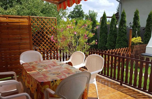 The holiday apartment is located in a single-family home built in 1998, was renovated in 2015 and is furnished in a modern style. The property is located in a holiday home area, in the town centre. Also due to its quiet and sunny location the domicile is popular. Available for use: sunbathing lawn, parasol, barbecue facilities, terrace and garden furniture.LocationBalatonkeresztúr, 104 m above sea level. The holiday apartement is located on a enclosed garden plot with meadow and flowers. The landlord lives permanently in a separate building on the property. Access is via a side road (asphalted). Parking (for 2 cars) is available on the property. Specialair conditioning, central heating (gas).Facilities: internet access (WLAN). TV reception takes place via satellite.For your safety, the accommodation is equipped with CO2 detector and smoke detector. Dogsnot allowed. DistancesShopping 200 m, restaurant 200 m, town center 400 m. Balatonkeresztúr: doctor 200 m, pharmacy 300 m and railway station, bank each 400 m. discotheque in Balatonmáriafürdő 400 m. thermal bath in Hévíz 25 km. indoor swimming pool in Marcali 10 km. sauna in Zalakaros 30 km. Railway line 400 m. In summer: Balaton 500 m in Balatonmáriafürdő (beach 500 m in Balatonmáriafürdő featuring meadow, sand and stones). fishing in Balatonkeresztúr 500 m. boat launch in Balatonmáriafürdő 1000 m. DivisionHoliday apartment, 1 floor, 5 rooms (including 4 bedrooms), 120 sqm, in total 10 beds (including 2 additional beds). RoomThe entrance to your holiday apartment is located upstairs and leads over 15 steps and an internal staircase directly into the living room. Living room (25 sqm) with sitting area, TV, dining area (8 seats) and access to the balcony. 2 bedrooms each (14 sqm) with 1 double bed and 1 additional bed on sleeping chair. Bedroom (12 sqm) with 1 double bed. Bedroom (12 sqm) with 1 double bed and 1 additional bed. Kitchen (8 sqm) with gas stove (4 flames), oven, extractor hood, fridge (200 l, icebox), microwave, coffee machine, toaster and electric kettle. Bathroom (6 sqm) with shower and 1 washbasin. Bathroom (6 sqm) with washing machine, shower and 1 washbasin. 2 Separate toilet each (2 sqm) with WC. Terms of lease and pricesIncluded in the priceinternet access, parking place, electricity, water, final cleaning, bed linen, Wireless Internet access. Side costs-Costs on the spot:/Obligatory:local tax by local tariff.On request:air conditioning 0,30 € per kilowatt hour based on usage. washing machine 0,90 € per stage of washing programme based on usage. heating 5 € per object per day.Deposit:EUR 100,-/object
