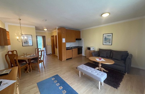 Well-kept flat in an apartment complex - close to the centre and yet in the countryside, idyllically situated on a romantic bend in the river. 2-room flat for 1-2 persons with balcony (one on the rainy side, one on the inside) or terrace. Our highlight: Daily 3 hours free entry to the complete AQACUR wellness and bathing world 200 metres from the flats, including giant tyre slide (departure day is not included, in March and September there are revision dates, the AQACUR is then closed for 5 days). Our service: underground car park with bicycle storage, washing machine and tumble dryer for a fee, breakfast and half-board can be booked within a 5-minute walk, pets welcome for a fee, free cot and high chair on request, free use of bus and train, WiFi The flat has a separate bedroom, a bathroom and a living room with a fully equipped kitchen