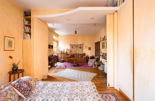 Our house is very bright, built with natural materials, embellished with art objects and antiques and with a warm oak parquet floor. The bathroom is equipped with a Moroccan-style bathtub, perfect for relaxing after a day exploring the sights of Rome. The kitchen is equipped with everything you need for cooking, including a practical dishwasher. The bedroom has a double bed, the living room has a double sofa bed and the two rooms are separated by large wooden sliding doors. The single bed is located in another room above the library, accessible by a staircase. The total area is 75 square metres, just a few steps from the Colosseum. Washing machine and Wi-Fi internet access are included.