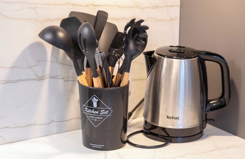 A top-of-the-range, fully-equipped kitchen opening onto the living room,