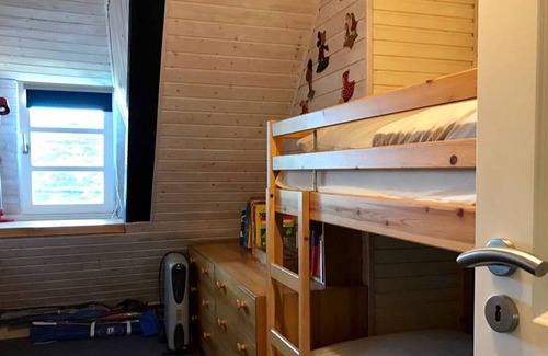 One bedroom with a 1.60 m bed is on the ground floor, the remaining rooms can be reached via a rustic wooden staircase to the upper floor.