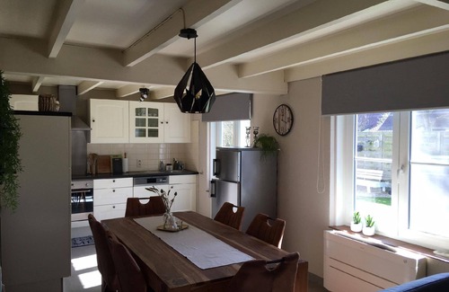 Inside, you are welcomed by a cosy living area with a comfortable seating area, including lounge and fireplace. The fully equipped kitchen offers everything you need: from a ceramic hob to a dishwasher and even a Senseo coffee machine. There is free WIFI and for entertainment there is a TV with satellite dish for German channels, log in to Netflix , a DVD player, and a radio with CD player. For extra conviviality, board games and tourist information are available.