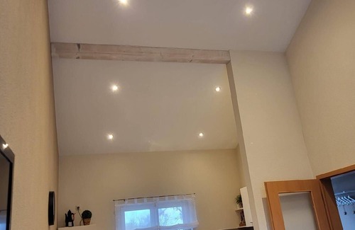 Here you are renting a 79m² holiday house with a living room and a well-equipped kitchen with a dining table. A bathroom with a bathtub, barrier-free shower and WC is also available. A hallway and two bedrooms, one with a double bed and the other with a single bed and a bunk bed, as well as an open gallery with two beds. Wi-Fi Internet, a dishwasher, tea towels, hairdryer, iron, ironing board, three TVs, electric blinds, a washing machine (payable), a cot and underfloor heating are available.