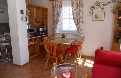 The family-friendly, sunny holiday house of around 62m² is suitable for four to five people in summer or in winter. You can experience a wonderful oasis of well-being here all year round. The lower floor has underfloor heating, whilst the upper floor has radiators. The combined living and dining room includes the new kitchen, equipped with all the necessary utensils, a dishwasher, microwave, fridge with freezer compartment, coffee machine and kettle. The visually separate living and dining room invites you to relax. You can dine together at the dining table after cooking. Satellite TV, a radio, a box of games and books are available. Stairs lead to the upper floor. There is a stairlift for the disabled. There are two bedrooms on the first floor, one with a double bed and one with a queensize bed (140cm wide). The master bedroom has a further satellite TV. Towels, tea towels and bed linen are provided. There is plenty of cupboard space. All the windows are fitted with fly screens. There is a storage room with a washing machine and dryer, broom, dustpan, two fridges with a freezer compartment and other useful items. There is a washing space next to it with a WC and washing machine. A little entrance area leads into the bathroom with a shower and WC. Note that the WCs in the house are higher than normal toilets.