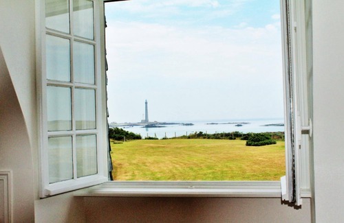 A large villa, classic, Breton, stately - a great property built from old granite stones. The terraces are large and promise a unique view of the largest granite lighthouse in the whole of Europe. In addition to the villa's superb construction, the beautiful, huge garden in front of the Phare de Ile de Vierge is certainly unforgettable. The property has a large entrance gate, a dovecote and a fountain, and a granite terrace to the south. Towards the lighthouse is the larger wooden deck. The villa offers plenty of space for twelve people in six bedrooms, three bathrooms, a fireplace and a large kitchen with direct access to the living room. You can also see the lighthouse directly from the living room through large windows. A man-sized fireplace, from an old manoir, is also located in the living area. You enter the villa through the large and open entrance area.