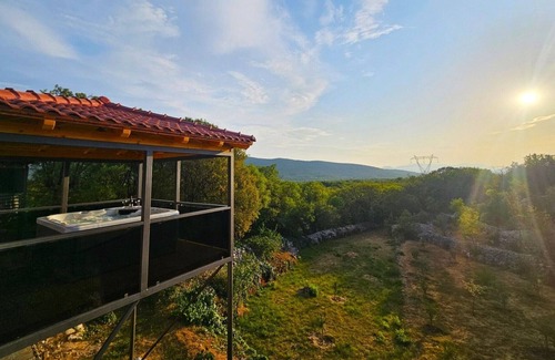 Villa Sena Lovreć - cozy 5 bedroom villa complex with a private heated pool, hot tub, garden, sports field, trampoline. Surrounded by trees and plants with a valley view. Just 20 minutes away from the beach with a car. To have a vacation with your family in peace, close enough to the beach and other activities, this villa is ideal. There is private parking for up to 4 cars.