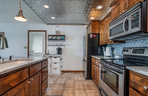 The kitchen might first attract attention with its all-new stainless-steel appliances but look upward for our favorite feature: a suspended ceiling of hammered metal tiles! The vintage look is complemented by a farmhouse sink that faces the sprawling backyard. A refrigerator with bottom freezer, smooth surface oven, microwave, and dishwasher are all at the ready. Within a few steps are four countertop barstools and a nearby dining table with two end chairs and bench seating. A Keurig coffee bar adds the finishing touch to the well-stocked kitchen.