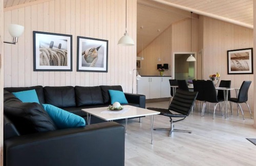 "Holiday Vital Resort (GBE122)", 4-room house 79 m2. Bright, modern and wooden furniture furnishings: living/sleeping room with 1 double bed, Scandinavian wood stove, dining table, satellite TV, CD-player and DVD. Exit to the terrace. 1 room with 2 beds. 2 rooms, each room with 1 double bed. Kitchen (oven, dishwasher, 4 ceramic glass hob hotplates, toaster, kettle, microwave, freezer, electric coffee machine). 2 showers/WC, hydro massage bath, Sauna. Electric heating. Terrace. Terrace furniture, barbecue (portable). Facilities: washing machine, dryer, children's high chair, baby cot. Internet (WiFi, free). Please note: non-smoking house. Smoke alarm.