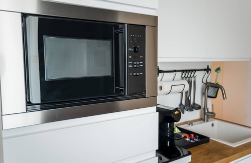 - Fully equipped kitchenette with stove, fridge, microwave, coffee machine, kettle