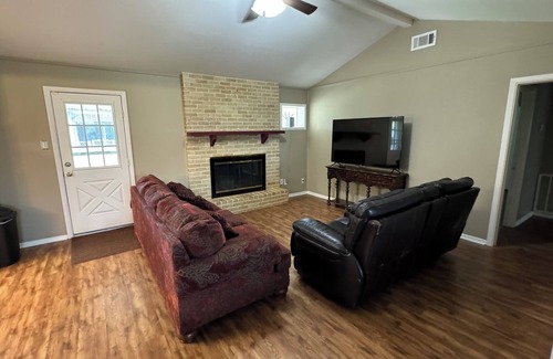 Unwind in College Station at this charming house. With 4 bedrooms including 2 king beds, 1 queen bed, and 4 twin beds, this excellent property offers a serene escape for guests. Enjoy amenities like WiFi, heating, AC, a washing machine, and more. This house sits on private family property with 6 acres all to yourself. It's easy to see why you'll be able to unwind at our place. This house is located on Wellborn Rd only 9 miles from Kyle Field, Olsen Field at Blue Bell Park, and Santa's Wonderland. This house is also only 11 miles from Reed Arena.