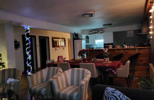 Inside, the apartment features a bright and inviting living room with a comfortable sofa and a fireplace that creates a warm atmosphere. The kitchen is fully equipped with modern appliances, and the large dining table is perfect for shared meals. The apartment includes a practical washer and dryer, making it easy to stay organized during your stay.