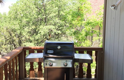 This rustic mountain cabin in a quiet residential neighborhood is tastefully decorated and has 3 TVs, fireplace, large jacuzzi/spa on a deck with views, ping pong table, covered garage, stocked with books & DVDs--everything you need for a private getaway. New flooring in living room. The master bedroom has a beautiful king size hickory bed, TV, and bathroom with tub & shower. Second BR has an oak queen bed, view of the hills. Third BR has two sturdy log bunk beds. Separate bathroom with 2 sinks, tub, shower. Fenced yard for your pet. Fully equipped kitchen. Near Bear Mountain and Moonridge Zoo. Neighborhood adjoins the San Bernardino Mountains Land Trust open space, wildlife habitat, and hiking trails. Perfect getaway with room for 2 families.