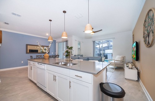Everyone in your group will love soaking up the Florida sun next to the home’s swimming pool. Relax with a good book and a chilled beverage on the huge private covered balcony area, where you can unwind on one of the sun loungers. You can barbecue ($$) use the heated ($$) private pool, and enjoy the modern touch it has to offer. You’ll love our home because of the neighborhood, the comfy beds, the kitchen, the easy access to the parks.