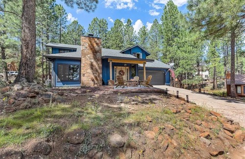 Tucked back into the Pines. Kick back and relax in this calm, stylish space with fully equipped kitchen, bbq, hot tub, 3 fire pits, gas fireplace in family room, electric fireplace in primary bedroom, and a fun game room! Enjoy peaceful nights stargazing or watching the wildlife. Close to hiking and Snowbowl. Just 10 minutes from downtown. 10 min to base of Snowbowl. 1hr from South Rim of Grand Canyon. Lots of trails, which are great for biking and walking! Kick back and soak in the warmth of the hot tub or play a game of pool.