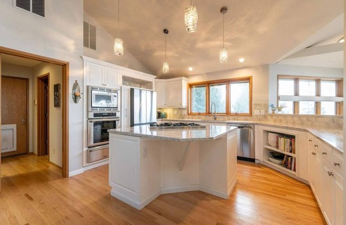 You'll also find four cozy bedrooms from the luxurious king bedroom to the charming bunk room, every space is thoughtfully decorated to ensure a restful night's sleep for you and your loved ones. There is also a desk in the guest room should you need to work during your stay. The kitchen features granite countertops, a dining table that seats 8, and all the appliances you’ll need including a Keurig, dishwasher, refrigerator, toaster, and microwave as well as a mini-fridge downstairs.