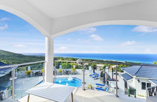 Beyond the double doors of this upper-floor luxury air-conditioned King bedroom are unobstructed views of the Caribbean Sea and the entire Beyond the Sea property. Equipped with a fan in the high vaulted ceiling, a large ensuite bathroom, a walk-in shower, and an individually climate-controlled unit, guests are transported to a tranquil and modern experience. Enjoy thoughtful amenities, including a hair dryer, safe, flat-screen Smart TV, work desk with multiple outlets, Keurig machine, mini-fridge, and more. A pool spa jacuzzi combo is 30 ft away—max occupancy of 4 guests.