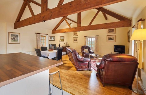 The open plan living, kitchen and dining room offers character and charm in spades. Boasting an incredible vaulted ceiling and original beams, this space has a traditional cottage feel. Gather your loved ones together and cosy up on the leather sofa and matching armchairs. Turn on the TV and keep up with your favourite shows on Freeview.