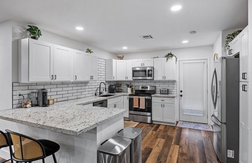 Your Tempe escape awaits! Relax in this spacious 4BR, 2BA retreat—perfect for families or groups of friends—featuring a private pool, hot tub, outdoor TV, and a cozy fire pit for stargazing nights. The open-concept layout is ideal for group hangouts, offering games like Cornhole, Pool Pong, and Scrabble to keep everyone entertained. The fully equipped kitchen with stainless steel appliances, cookware, utensils, and a Nespresso machine makes it easy to feel at home, while the dining area seats eight for shared meals or game nights.