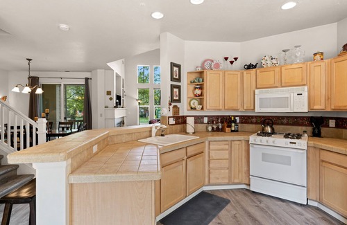 Old Mill Proxi is a newly updated 2 bedroom, 2.5 bath townhouse that is bright and airy with vaulted ceilings that is tastefully furnished and boasts a roomy living area with fireplace and a fully equipped kitchen, bar seating for four, dining table for six, washer & dryer, private patio with BBQ, and patio furniture. enjoy your morning coffee on your private patio.