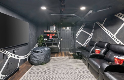 The theater room has leather reclining theatre seats, surround sound, and a popcorn and candy bar as you enjoy your favorite shows or movies.