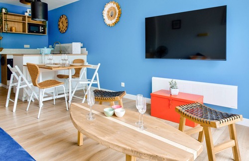 The living room is furnished with a dining area, and a lovely TV lounge with its double sofa. The bay window allows you to access the terrace, where a plancha awaits you to prepare delicious grills, to be enjoyed in the open air.