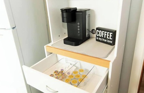 The kitchen is equipped with a coffee maker, toaster, microwave, fridge, oven and electric stove. Necessary cookware and utensils are provided as well as coffee, sugar, milk, salt, pepper and baking spray.
