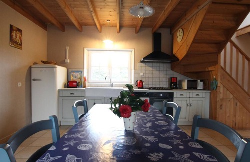 Detached house. On the ground floor: Living room with pellet stove (TV, radio, fiber optic internet). Kitchenette (gas hob, microwave, dishwasher, freezer compartment). Laundry room (washing machine). Shower room (sink, towel dryer and shower cubicle). Separate toilet. Upstairs: Bedroom 1 (1 bed 140x190, 1 cot with bars). Bedroom 2 (2 beds 90x190). Private enclosed courtyard. Parking. Covered shelter. Picnic table. Garden furniture. Barbecue. Ping-pong table. Electric heating at an additional cost. 1st bag of pellets free, subsequent ones charged at €6. Bed linen for hire (blankets). Towels and table linen not provided. Cleaning service optional. 2 pets max (chargeable). Charming house in the heart of a typical village in La Hague. Children will have plenty of time to play on the enclosed grounds and will appreciate the playroom with its ping-pong table. Sea views from the ground floor and upstairs.