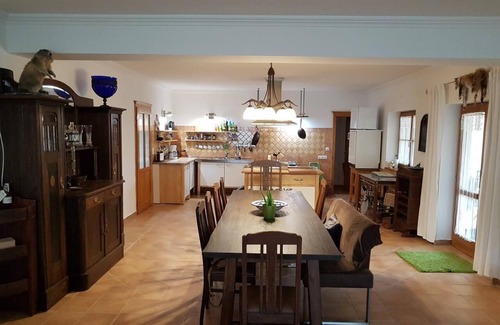 3 bedrooms, 3 bathrooms, hunting, dog, leisure, dog training.The hunting and holiday house Steirerengel is a spacious, newly renovated, tastefully furnished holiday house with 3 double rooms. Each room has its own bathroom and TV. A large, completely furnished kitchen-cum-living-room as well as an inner courtyard give possibilities for sociabilities. The object (approx. 4000 m²) is completely fenced in. Dogs are welcome guests. Grill in the garden, Hollywood swing, free WLan, dishwasher, washing machine, dryer, parking lots on the area. The famous spa Bükfürdö is only 4 km away.Short descriptionOther : Non-smoking houseShort description 1Number of kitchens : 1Living room 1Other living room features : Large couch corner, dog bed in living areaBedroom 1Other bedroom furniture : Room Conner, couch, TV, closet, desserts, bath with shower, WC, washbasinBedroom 2Other bedroom furniture : Room Jule, wardrobe, chest of drawers, desserts, couch, table, opposite bathroom with shower/WCBedroom 3Other bedroom furniture : Room Henko, double bed with desserts, chest of drawers, table, couch, armchair, dressing room, terrace exit, adjoining very large bathroom with bathtub, washbasin, WC, washing machine, dryerBathroom 1Other bathroom equipment : Bathroom Conner, newly built, at ground level, LED light stripBathroom 2Other bathroom equipment : Bathroom Jule, small bathroom with large shower, washbasin and toilet.Bathroom 3Other bathroom equipment : bathroom Henko, very large bathroom with bathtub, washbasin, WC, washing machine, dryerKitchen 1Other kitchen equipment : Very large kitchen-cum-living-room with fully equipped kitchen. DishwasherSurroundingNearby sports facilities : Bike tours, Golf course, Hunting facilities, Riding possibilitiesRental Facilities : Bicycle rental serviceSurrounding 1Excursion possibilities : Budapest, Lake Balaton, Vienna (aftermarket), Lake Neusiedl (water sports), shopping (Outletcenter Dr. LupoLocation description : Locs is a charming little village close to the famous spa Bükfürdö. Locs, also known as the Rose Village, captivates with its blooming rose splendour throughout the summer and into autumn.Garden and outdoorGarden facilities : Garden furniture provided, GrillService benefitsService facilities (may incur additional costs) : Cleaning service during your stay, Cook, Shopping service before arrival, Transfer service (airport etc)