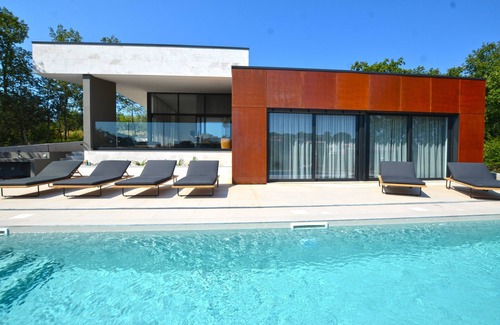 Luxury villa with a panoramic view of the small Istrian village Šorići and surrounding olive forest, only 7 km away from Rovinj. The location of the villa respects the privacy of each guest, but also enables easy access to important roads and urban facilities. The house sits on 930 sqm of land and develops horizontally, with two cubic volumes, one covered in beautiful stone, and the other in reddish corten façade. Inside spacious, light-filled living areas, and latest Hi-Tech equipment makes this villa a luxurious haven of comfort. Outside, the covered terrace and the pool area offer the perfect lounging atmosphere. Each of the 4 bedrooms has access to the garden and is equipped with its own bathroom with underfloor heating. House K2 has been designed to create a sophisticated living atmosphere that meld beautifully with the surrounding Mediterranean landscape