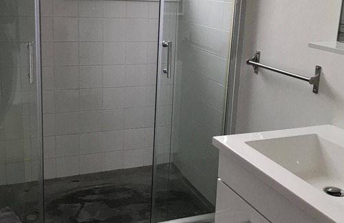 Bathroom, toilet, laundry with washing machine, dryer and freezer.