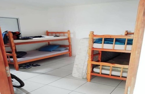 house in Caraguatatuba Praia das Palmeiras, located 1km from the beach, and the house has 02 bedrooms, 01 bedroom with 03 bunk beds and another bedroom with 02 bunk beds and a double bed, 02 bathrooms, large kitchen with refrigerator, and large room, barbecue area with refrigerator, pool, and parking space for 03 cars, with TV and wifi.
