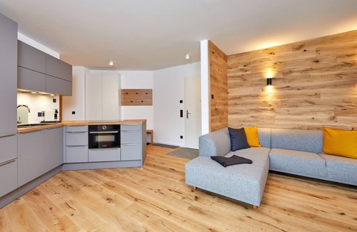 You open the entrance door and a spacious, open living-dining area in modern Alpine style welcomes you. Put your feet up on the comfortable sofa, framed by modern old wood.