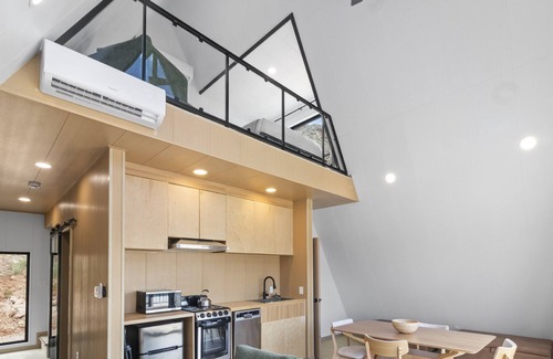 Inside, this unique home features a modern design and ample space for up to six guests. The main floor features a queen bedroom, while the open loft features another queen bed. For additional guests, two twin beds can be made up upon request prior to your arrival.