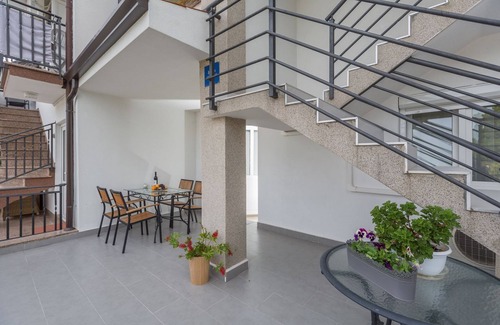 The flats are located in the Porec Jug district, just 600 metres from Brulo beach, sports facilities and restaurants. The old town centre of Porec is only a 15-minute walk away. The landlord lives on the 3rd floor and there is a car park in the courtyard. A total of 3 holiday flats are rented out in the house. This holiday flat for 2 persons is located on the 1st floor and consists of a living room with satellite TV, dining table, kitchenette, small bedroom with double bed, shower/WC and a beautiful covered terrace with seating. Air conditioning and WLAN internet connection are available.