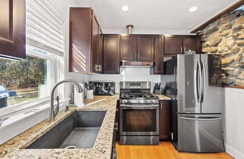 Hardwood floors, natural sunlight and central air is found throughout. Step into this home and take in the beauty of the amazing stone fireplace that is located in the center of the home. Large flat screen is perfectly hung on the fireplace with two full couches and a coffee table. A lovely dining area that comfortably seats four is open to the family room. The updated kitchen features shaker style cabinetry, granite countertops and chic black stainless-steel appliances. Two bedrooms with a jack and jill bathroom are located off the family room. Both bedrooms have queen size beds, one bedroom has a TV. The bathroom has a washer and dryer, shower stall only and a vanity with a granite countertop. An office/studio space has a futon, the futon folds down into a full-size bed, this room can be used as a third bedroom if desired. Barbeque on the spacious deck that includes a gas grill and outdoor seating. Good sized yard which is great for yard games and of course, an outdoor shower. The outdoor shower has hot & cold water and is fully enclosed.