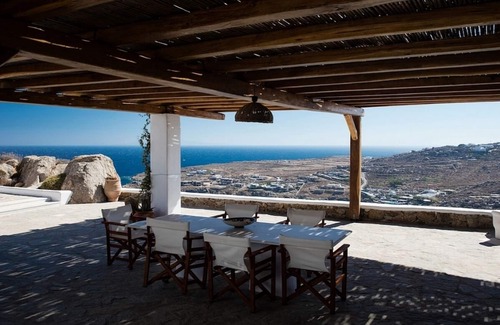 Villa Ambrosio is situated in a privileged spot just 3 minutes from the beach with panoramic views to the Agean sea, the islands of Paros, Naxos, Sifnos, Ios and Super Paradise beach and aims to please the senses. From the spacious and airy outdoor spaces covering a total of 2,000 m², to the tasteful guestrooms and functional interiors the attention to detail is evident in the choice of the most quality materials. The property can comfortably accommodate up to 18 guests and covers a total of 300 m² featuring eight bathrooms and nine double bedrooms, three of which have en-suite marble bathrooms that stand out due to the imaginative hand-carved drawings made by artisanal marble craftsmen from nearby Tinos island. The bedrooms on the first floor offer uninterrupted sea views, a large terrace with a sitting area in the master bedroom provides a romantic setting for a couple and two additional guesthouses, totally independent from the house offer privacy. The fully equipped kitchen, living room and dining room in shades of white and grey are on the ground floor and special attention has been paid to lighting with the impressive light fixture in the living room bearing the signature of Le Corbusier. The furniture is all hand-made by well-known designers using solid oak wood and all guest rooms have either air conditioning or ceiling fans, there is Wi-Fi Internet connection and also audio equipment available. Outside the large swimming pool, measuring 10 x 20 meters with a maximum depth of 3.4 meters is ideal for kids of all ages and the landscaped gardens of cactus, laurels and cypresses provide privacy. There are several relaxation areas around the pool with sofas and sunbeds accommodating the changing needs of night and day plus a special lounging area which is literally carved into the rocks, isolated from the rest of the house with fantastic views across the Aegean sea. A choice of three outdoor dining areas protected from the sun and the wind under large pergolas of chestnut wood, a built-in marble table, a wooden dining table and a rotunda are available for dinner under the stars and serviced by a fully functional outdoor kitchen and barbecue providing the ideal setting for all kinds of events. Villa Ambrosia is within close proximity to beaches, bars and nightlife yet still offers peace, tranquillity and privacy plus amazing views to the sea.