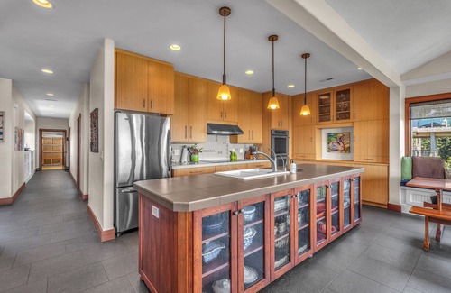 Pelican's Perch soaks up the sun on the south bluff of Pacific Seawatch. Overlooking the Nestucca River Estuary, and Wildlife Refuge, and showing casing the expansive view of the Pacific Ocean, the scene is always changing. Watch the eagles perch in the nearby massive Sitka Spruce trees, deer wade across the river, and fishermen wrestle salmon into their boats while you enjoy a glass of wine or cup of coffee on the covered deck. This beautiful home showcases fine craftsmanship with its warm woodwork and comfortable décor. Large, cozy sofas beckon you to curl up with a blanket and a book after a day on the beach in front of a roaring fire. Enjoy the game while snacking on goodies prepared in the gourmet kitchen complete with double ovens, 5 burner cooktop, quality cookware, and utensils.