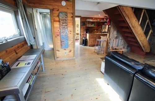 This place is a gem. It's a d-log structure that was both a bookstore and coffee shop in it's past life. We have remodeled it back into a two bedroom home with a loft, sleeping a total of six. Each bedroom has a queen sized bed. There is a futon in the loft area with a full sized 10" foam mattress that very comfortably sleeps two more. Upstairs you will also find an office nook with a desk. WI-FI is on site.