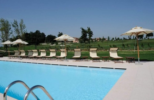 Activities: With a passage at the sole disposal of the guests of the estate one easily reaches the Club House of the Golf Club. The Golf course winds along the sweet hills of the Lake Garda region, interrupted by striking views of the Monte Baldo and of the blue of the lake. The 18 championship holes extend on a surface of 800,000 square meters. At the Golf Club there is a sports centre with soccer and five-a-side soccer fields, tennis courts, basketball courts, beach volley, a semi-Olympic swimming pool, a children's swimming pool and a Wellness centre (payable locally).