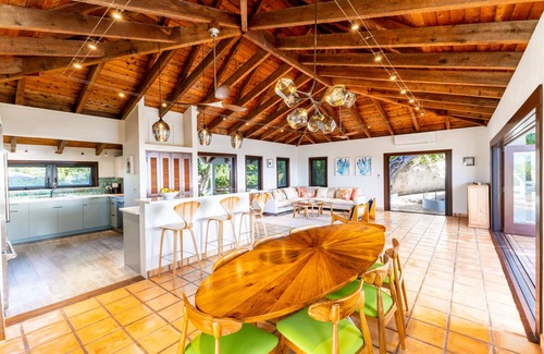 Upon entry to the main house, the expansive sea view takes center stage through mahogany bifold glass doors which open and are fully screened to provide the BVI’s signature trade wind breezes. The villa’s main floor is an open plan comprised of the living, dining, and kitchen areas. The living area has a very large L-shaped sofa and 2 chairs. A large smart TV (with an NYC-based streaming TV subscription) is concealed within a custom-made cabinet. A turntable and a selection of albums, along with high-end portable Bluetooth speakers allow for audio throughout the property.