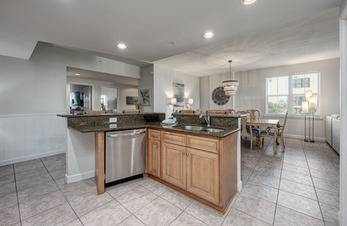 This exquisite 3-bedroom, 3-bath SLEEPS up to 10 guests. In this beautiful kitchen, you will find stainless steel appliances, granite countertops, and ample space for all to join in on the cooking. You’ll appreciate the open concept as you breeze straight from the kitchen to the dining area boasting a large, 6-seat dining room table, granite wet bar, and four high-top barstools that push up to the kitchen bar. Subtle coastal hues enhance the living area which showcases a large sofa, loveseat and comfortable chairs to provide seating for all.