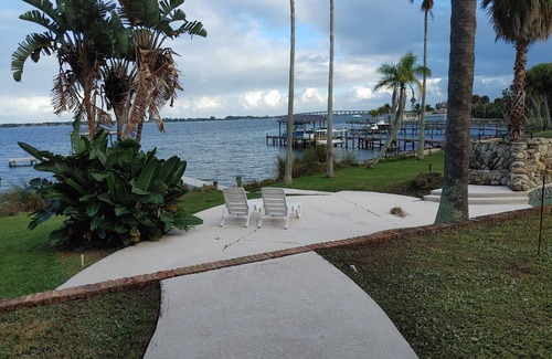 Property is located on the intercoastal waterway also know as Indian river, 1.2 acres of grounds lined with lush tropical coconut palm tress and other tropical landscaping. Covered deck all around lower level. One bedroom apartment with private entrance located on lower level at front of house. Full kitchen, 1 queen bed, 1 full bed and 1 futon, can sleep 4. Beautiful views of intercoastal waterway from back yard.