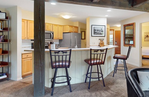 This home features an open-concept kitchen, dining area, and living area with a gas fireplace and exposed wooden beams on the ceiling. There is a furnished balcony accessible from the living room and the primary bedroom - perfect for alfresco dining or just relaxing with your morning coffee. The condo also has three TVs, an iPod docking station, and free WiFi for your enjoyment.
