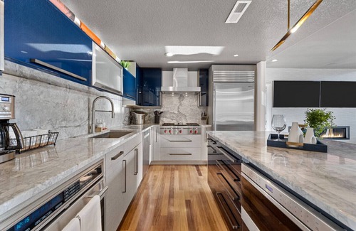Enjoy the dual OLED flat-screen-TVs in the living room with complementary Hulu+ESPN+Disney+ for all guests. Take advantage of the premium appliances and cook a meal to enjoy in front of the press-button fireplace. Or work from home in style!