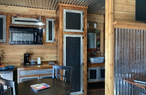 The Iron Door Cabin has a spacious king size bed with a walk-in tiled shower. Barn wood, knotty pine, and corrugated tin are used throughout this spacious cabin. Dark stained concrete floors and tin ceilings really add a rustic yet elegant vibe. The kitchenette area has a mini fridge, microwave, k cup coffee maker, along with table and chairs. There is also a comfy loveseat.