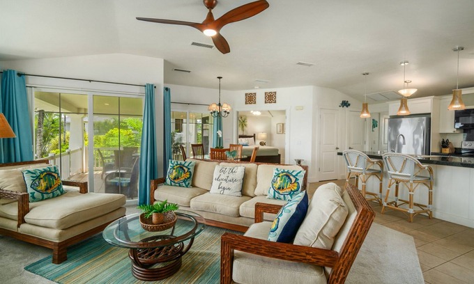 Aloha! We welcome you to our beautifully decorated and loved island home. Located in the heart of Princeville and centrally located to stunning beaches, restaurants, retail, and more. This is the perfect place to recharge and relax after a day of island adventure. You will find this home is loved and expertly cared for. The Kitchen is fully equipped and bedrooms spaced apart for privacy. Enjoy the extra large furnished lanai that looks out towards the resort pool, jacuzzi and waterfall feature. Parking is complimentary, NOTE:No air-conditioning in 1 of the guest bedrooms.