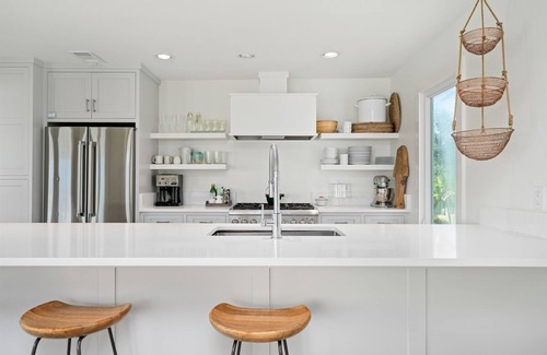 As you enter the front door you are greeted with vaulted ceilings and large, picturesque windows overlooking the water. The minimalistic coastal décor throughout the home creates a perfect environment to unwind and relax. There are three bedrooms upstairs, the first and second bedrooms have a King-sized bed. The third bedroom upstairs has two sets of built-in bunk beds and is a great room for the kids. Downstairs is a detached guest bedroom with private access. Inside you will find a queen-size bed, twin-size bed, and a bathroom with walk-in shower.