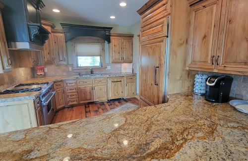 With stunning Teton views, this 4-acre, 5000 SF, 5-bedroom home with two living areas accommodates 12 adults. Rest easy on brand new cool-gel memory foam mattresses, bedding and pillows on every bed! The fully equipped chef’s kitchen includes a professional Wolf gas range and Sub-Zero refrigerator.